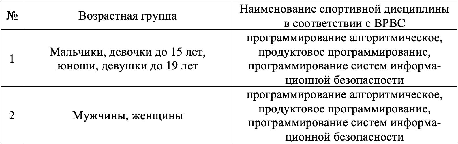 4.2 В рамках чемпионата для возрастной группы школьников мальчики, девочки (до 15 лет) и юноши, девушки (до 19 лет) будут проведено Первенство Краснодарского края по спортивному программированию (дисциплины «программирование алгоритмическое», «продуктовое программирование», «программирование систем информационной безопасности»).